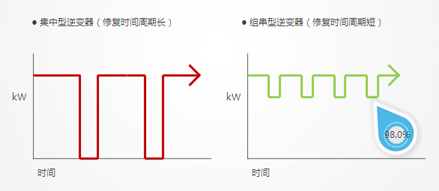原因二:組串式逆變器還具有自耗電低、故障影響小、更換維護方便的優勢。集中型逆變器自身耗電以及機房通風散熱耗電大,系統維護相對復雜,出現故障時,整個電站會癱瘓,組串型逆變器出現故障時,只有一串組件會停止發電,整個電站可以照常運作,從而很大程度上降低了損失。另外,組串式并網逆變器的體積小、重量輕,搬運和安裝都非常方便,不需要專業工具和設備,也不需要專門的配電室,在各種應用中都能夠簡化施工、減少占地,直流線路連接也不需要直流匯流箱和直流配電柜等。這就意味著組串型逆變器的修復時間周期要比集中式逆變器的修復周期短,下圖為集中型和組串型逆變器的修復時間周期對比。